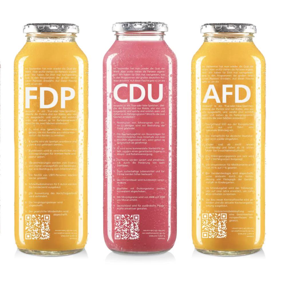 Mit dabei ist auch die afd, zum unmut von edeka. True fruits hatte anlässlich der bundestagswahl 2021* eine sonderedition seiner smoothies auf den markt gebracht, die groß mit den namen der parteien cdu*, spd*, grünen*, fdp*, linke* oder afd sowie auszügen aus dem jeweiligen parteiprogramm etikettiert waren. True fruits hat zur bundestagswahl flaschen bedrucken lassen. Ihr möchtet immer über aktuelle themen informiert sein? Der getränkehersteller hat vor der bundestagswahl auszüge des parteiprogramms abgedruckt.